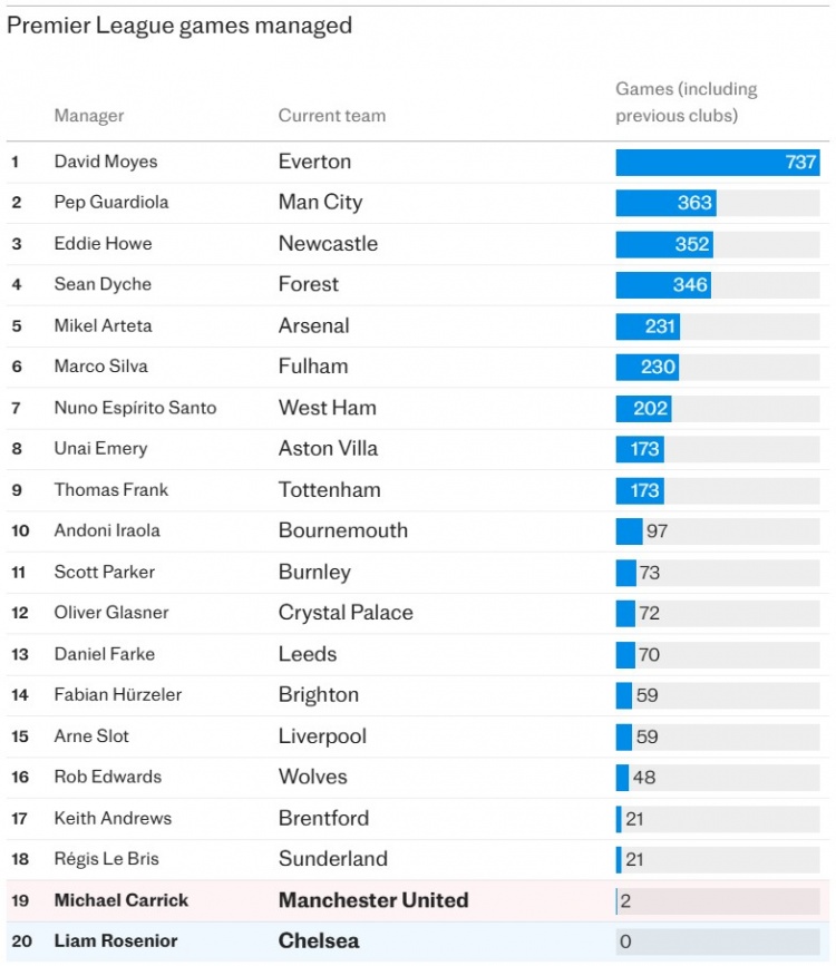 下图:目前英超球队教练已执教英超比赛的场次(数据包括执教的前英超俱乐部)